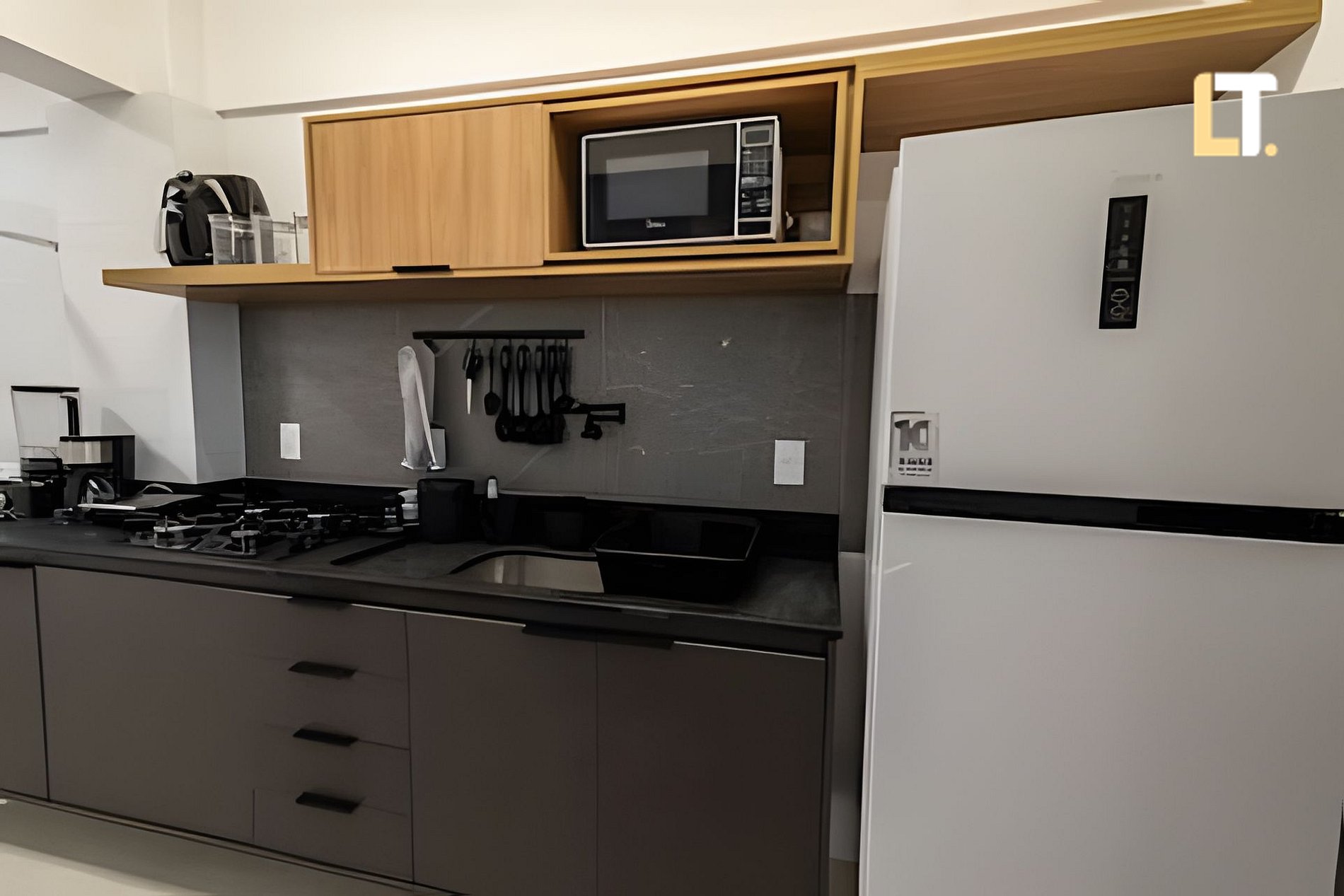 Cozinha equipada com utensílios, Louças, Talheres e eletrodomésticos para você poder preparar suas refeições no apartamento.